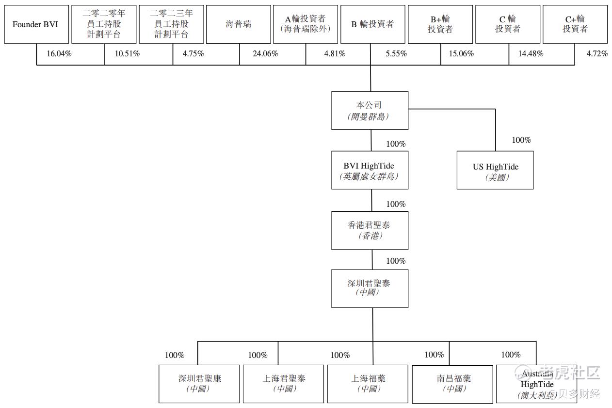 此外,君圣泰的股东还包括海普瑞、前海海创、泰格医疗、同创伟业等。IPO前,Founder BVI持股16.04%,2023年员工持股计划平台持股4.75%,2023年员工持股平台持股4.75%,海普瑞持股2.68%。