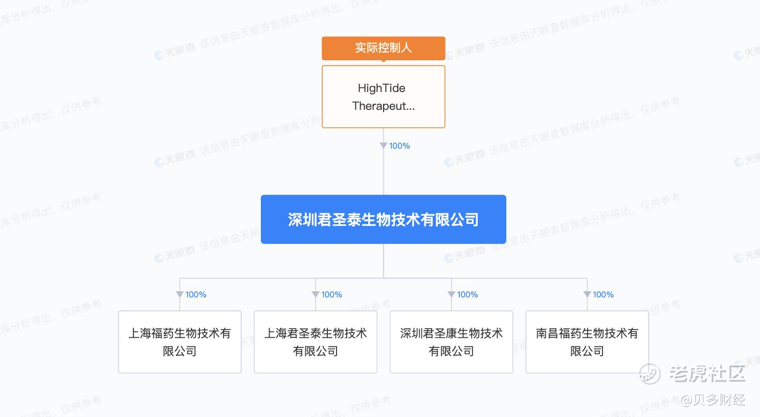 据了解,君圣泰的经营主体为深圳君圣泰生物技术有限公司。天眼查信息显示,该公司的注册资本约为3.11亿元,法定代表人为LIPINGLIU(刘利平),全资股东为HighTide Therapeutics (Hong Kong) Limited。