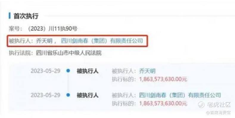 【剑南春及其董事长乔天明新增被执行信息,执行标的超18.63亿元】天眼查App显示,5月29日,四川剑南春(集团)有限责任公司及其董事长乔天明新增一则被执行信息,执行标的超18.63亿元,案号为(2023)川11执90号,执行法院为四川省乐山市中级人民法院。(天眼查App)