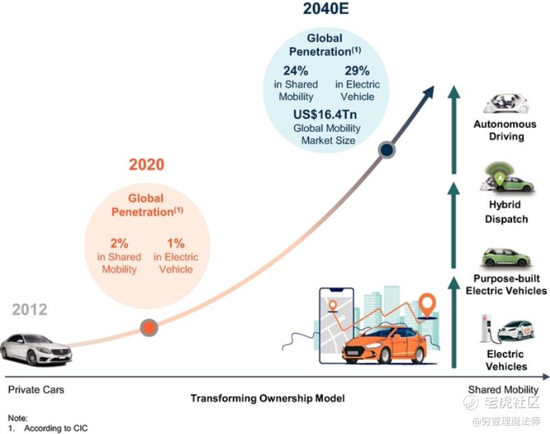 2020 年全球移动市场规模为 6.7 万亿美元,但共享出行和电动汽车在全球的渗透率分别为 2% 和 1%。根据CIC的数据,到 2040 年,全球移动市场预计将达到 16.4 万亿美元,届时共享出行和电动汽车的渗透率预计将分别增加至 23.6% 和 29.3%。