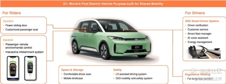 滴滴D1专为网约出行市场打造,由滴滴联合比亚迪共同设计开发,从外观到内饰均针对出行场景深度定制。D1配备前置单目摄像头及毫米波雷达,是首款搭载AEB系统的网约车,提升车辆驾驶安全性。车辆搭载由比亚迪弗迪生产的磷酸铁锂“刀片电池”。续航方面,车辆综合续航里程为418km,以网约车的使用场景来看,基本上是每日行驶里程的两倍还有余。