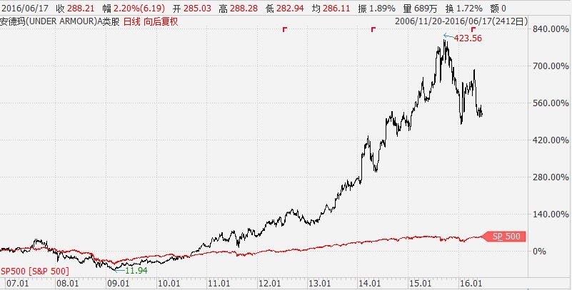 良好的业绩也支撑着安德玛的股价高涨: