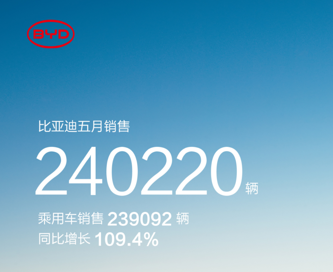 比亚迪 5 月产量及销量分别为 246259 辆和 240220 辆,同比增长 108.46% 和 108.9%。