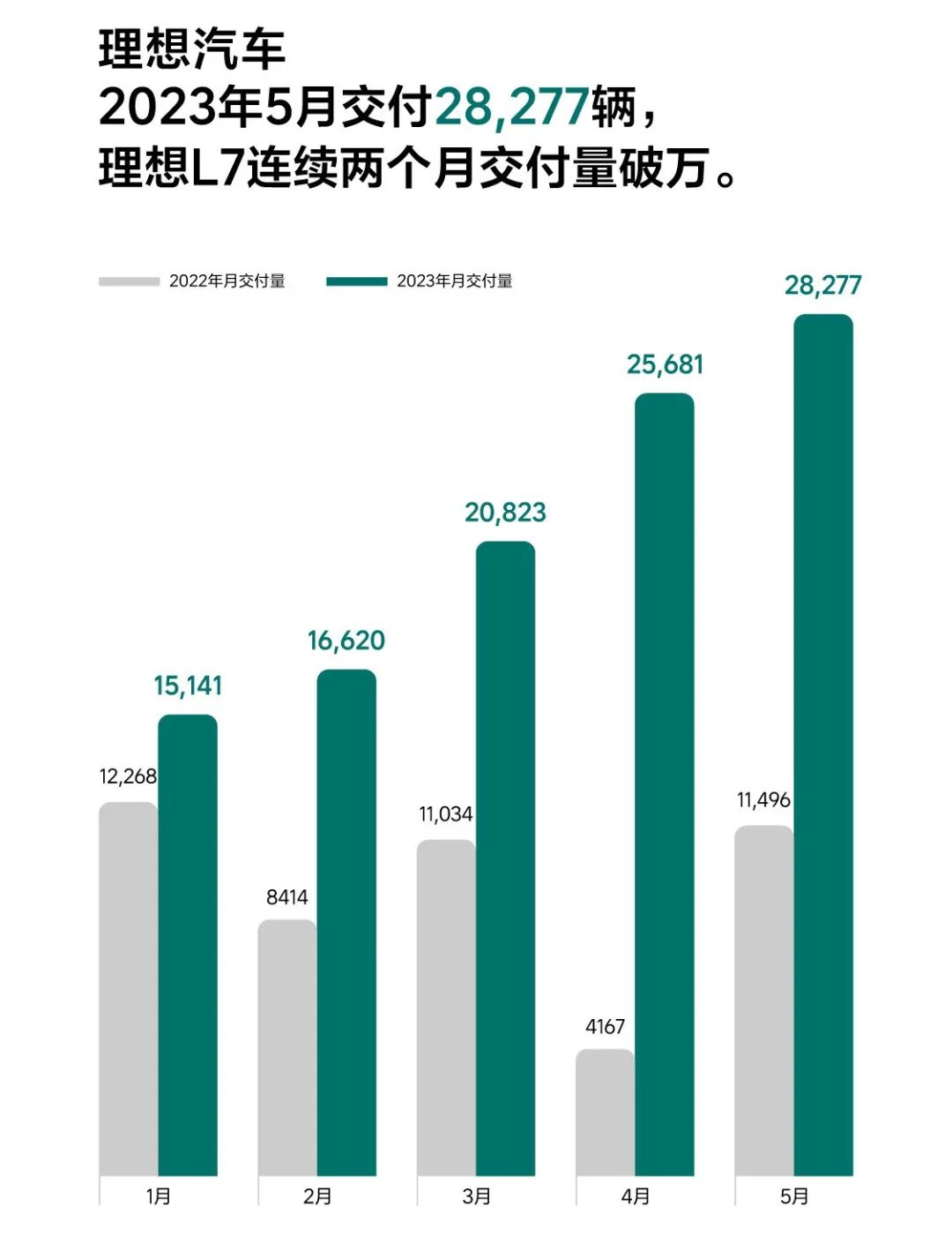 理想发布 5 月交付量为 28277 辆,同比增长 146.0%,再创新高。