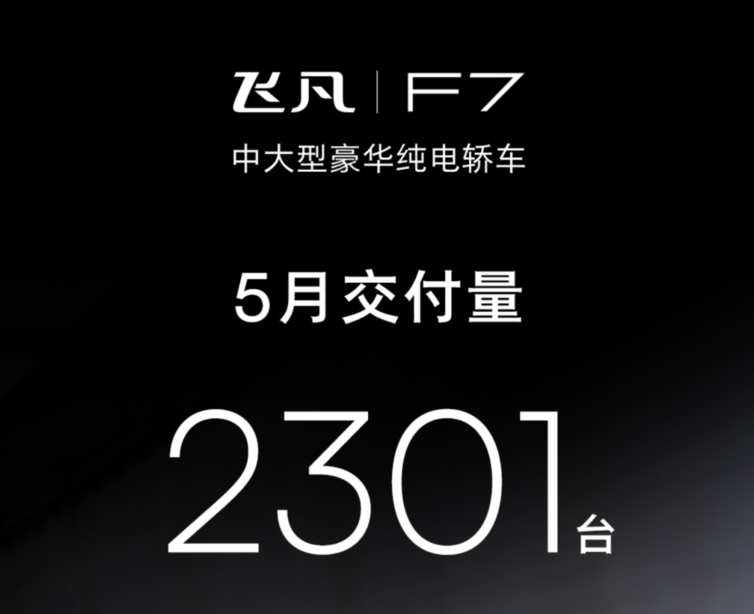 飞凡公布了 F7 的 5 月交付量:2301 台,环比增长 84.37%飞凡 F7 平均订单价值 25.24 万元,超 53% 的用户选择车电分离购车方案。