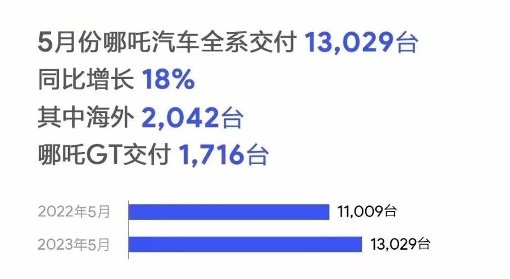 5 月,哪咤全系交付 13029 台,同比增长 18%。