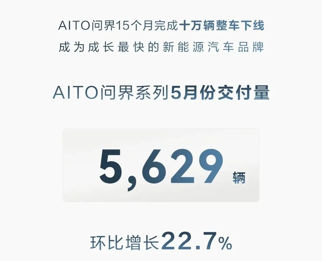 AITO 汽车 5 月交付量为 5629 辆,环比增长 22.7%。