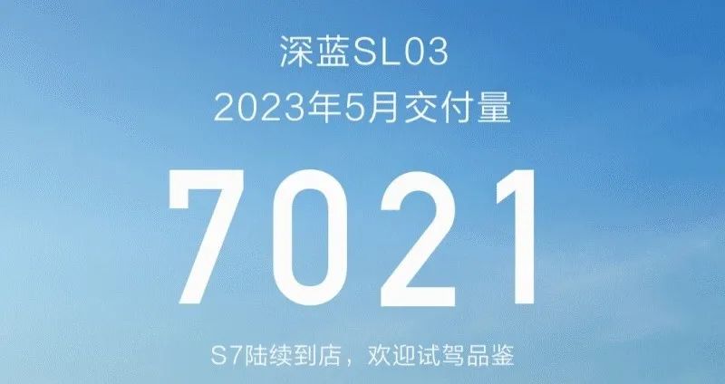 深蓝汽车公布了 SL03 5 月销量 ,为 7021 辆,相较于 4 月的 7756 辆,5 月销量环比下降 9.48%。