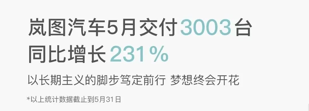 岚图 5 月交付量为 3003 台,同比增长 231%,环比下降约 10%。