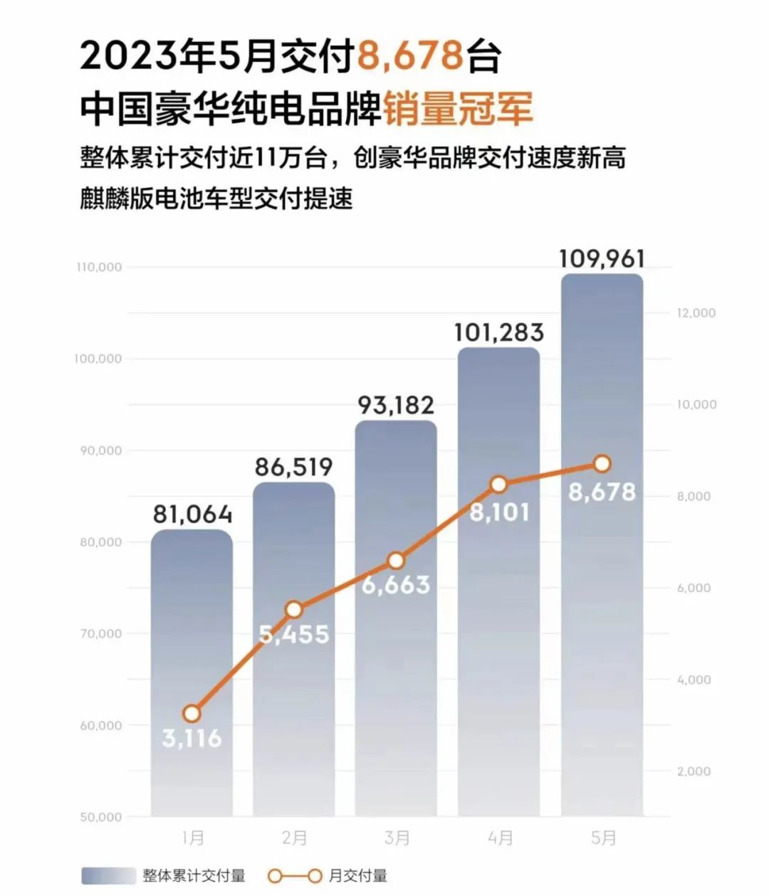 极氪发布 5 月交付量:8678 辆,同比增加约 100%。极氪的交付量也逐渐有所回暖,极氪 X 也将于本月交付。
