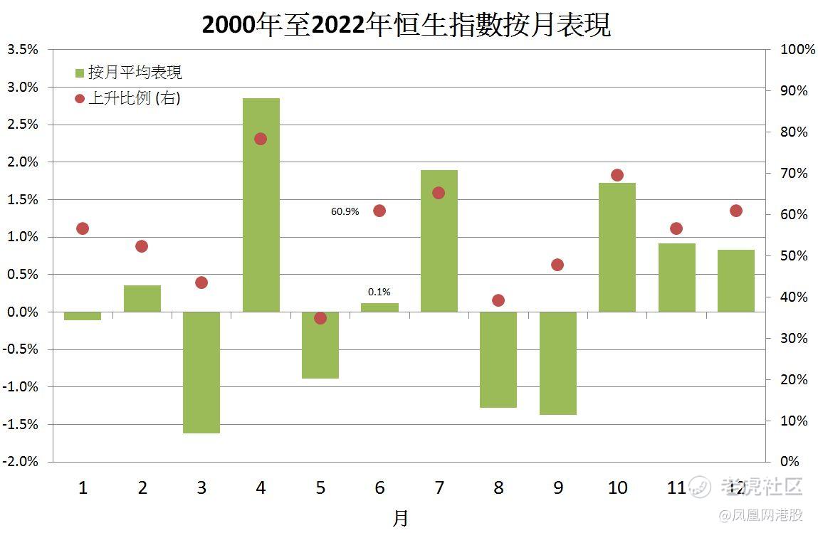 根据2000年至2022年恒生指数的按月表现,可见6月份的平均表现大致持平,只是微升0.1%(图1)。而且更重要的是,上升比例(不是下跌比例)约达6成,即23年里有14年录得按月上升(不是按月下跌)。
