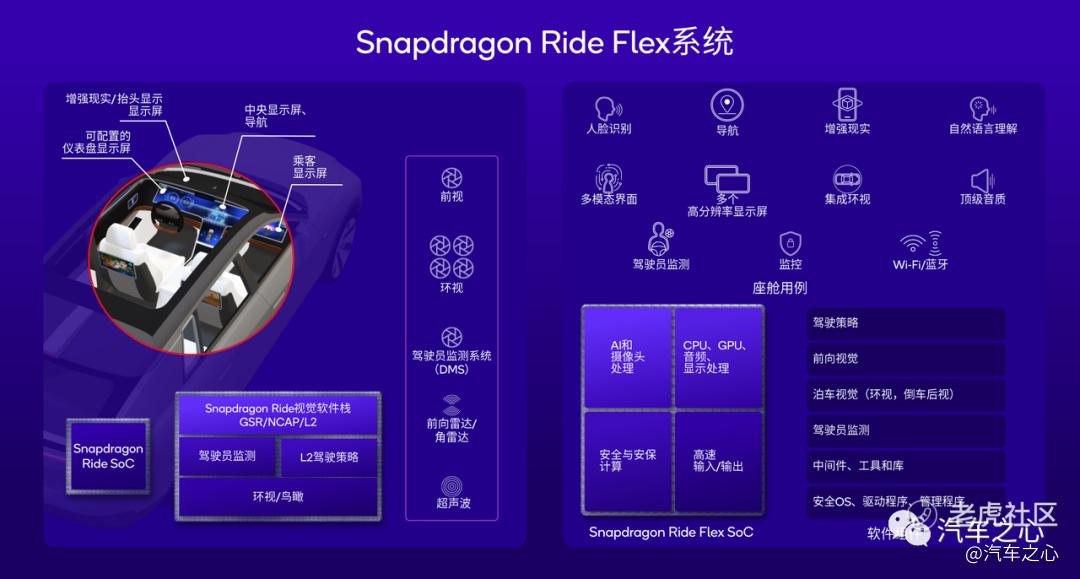 2023 年 1 月,高通发布了第二代 Ride 的升级版 Ride Flex 芯片(第一个产品是 SA8775),主打舱驾一体,既能用于车内座舱,又可以实现辅助驾驶的可扩展系列 SoC。