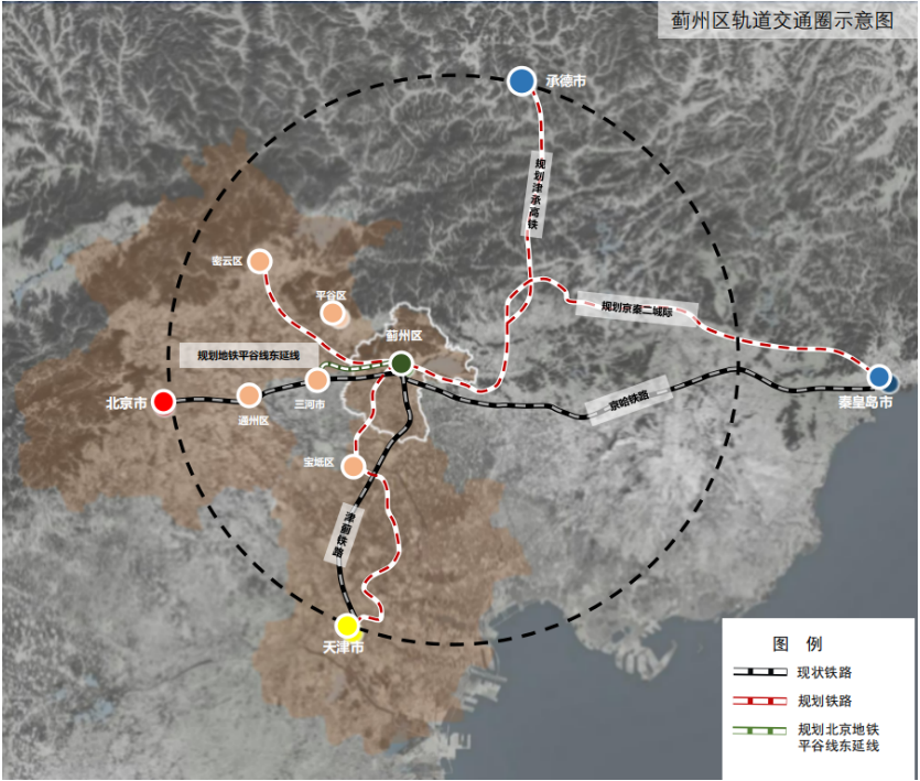 作为京津冀协同发展核心圈的重要节点城市,蓟州已融入环北京交通圈,已开通至北京的高铁,1小时可直达北京。津蓟、塘承、蓟平、京秦“两横两纵”高速路网贯穿境域,贯通京津。同时,规划多条京津冀城际铁路接入蓟州站,近期推进津承城际铁路(规划中)建设,远期推动京秦二城际(规划中)、北京地铁平谷线(22号线)东延线(规划中)等重点项目,依托轨道交通融入环首都50公里通勤圈。
