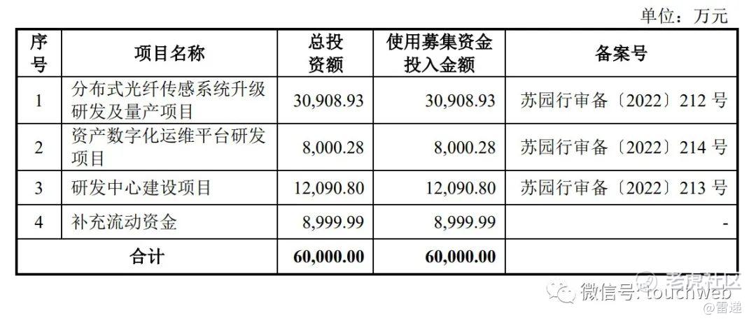 光格科技计划募资6亿,其中,3.1亿元用于分布式光纤传感系统升级研发及量产项目,8000万元用于资产数字化运维平台研发项目,1.2亿元用于研发中心建设项目,9000万元用于补充流动资金。