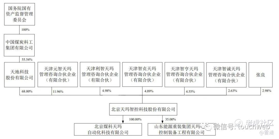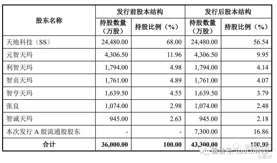 IPO后,天地科技(SS)持股为56.54%,元智天玛持股为9.95%,利智天玛、智贞天玛分别持股为4.14%,智亨天玛持股为4.07%,张良持股为2.48%,智诚天玛持股为2.18%。