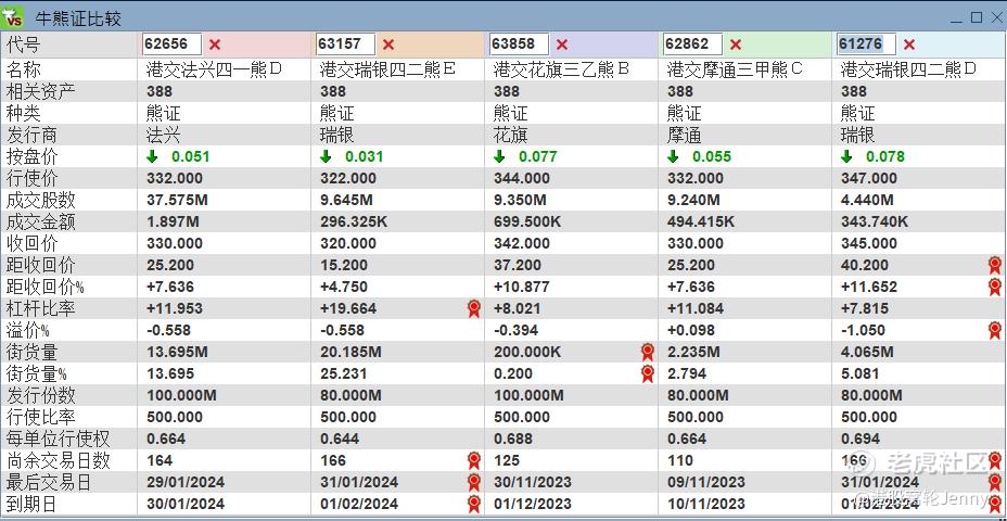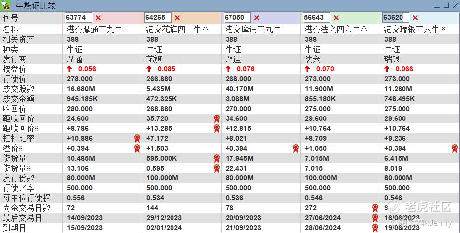 市场上亦有投资者会利用熊证捕捉看淡交易机会,因为熊证杠杆往往比认沽证高,不过,投资者要留意,熊证有收回机制,所以对于收回价的考虑应比较保守。相对稍远的熊证产品有62862,收回价330元,杠杆11.1倍,2023年11月份到期,条款相近的产品有3只。