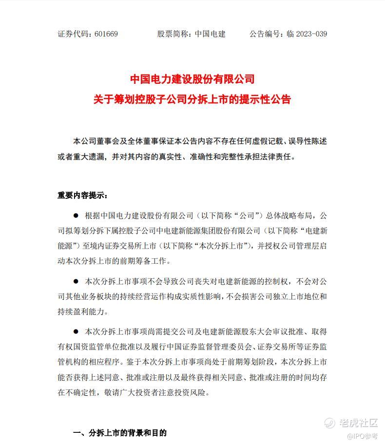 $中国电建(601669)$ 【中国电建:拟筹划分拆子公司电建新能源至境内证券交易所上市】中国电建6月2日发布公告,公司拟筹划分拆下属控股子公司电建新能源至境内证券交易所上市,并授权公司管理层启动本次分拆上市的前期筹备工作。截至公告披露日,公司直接及间接通过子企业持有电建新能源99.96%的股份。电建新能源正在推进引入战略投资者相关工作。截至本公告披露日,电建新能源确定引入10名战略投资者。本次增资完成后,电建新能源的注册资本由60亿元增加至75亿元。本次增资尚待完成工商变更登记等手续。(公司公告)