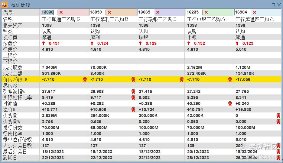 工行(1398)认购证成交活跃区间一共有9只产品,杠杆在9.7倍至10.2倍,13065及13038实际杠杆相对较高,分别有9.9倍及9.7倍。工行(1398)而认沽证成交活跃区间有3只产品,杠杆在10.4倍至11.6倍,11989及14683实际杠杆相对较高,分别有11.1倍及10.4倍。