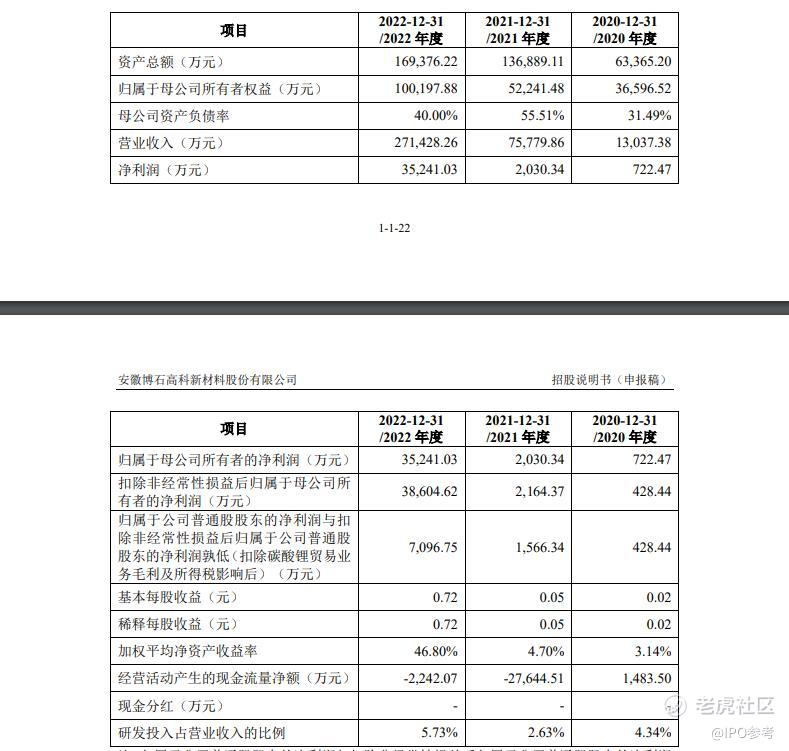 【博石高科冲刺创业板IPO】6月2日,安徽博石高科新材料股份有限公司递交创业板上市招股说明书(申报稿)。该公司本次拟发行股数不超过8810.1743万股且不低于5547.1468万股。博石高科是一家专注于锰基正极材料研发、生产和销售的企业。2020年至2022年,该公司营业收入分别为1.30亿元、7.58亿元、27.14亿元,扣非净利润分别为428.44万元、2164.37万元、3.86亿元。(公司招股书)