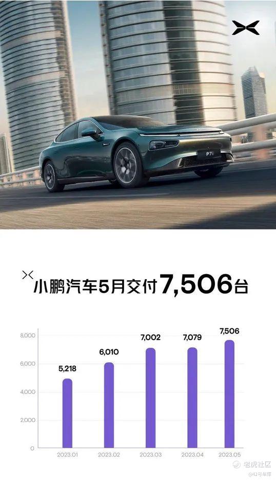 小鹏汽车 $小鹏汽车(XPEV)$ 5 月交付量为 7506 台,环比增长 6%。今年以来,小鹏的月交付量在逐月提升,P7i 的交付量也环比大幅增长。