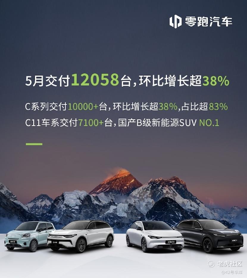 零跑 5 月共计交付新车 12,058 台,相比 4 月增幅明显,且 C 系列交付破万,环比增长超 38%,占比超 83%。