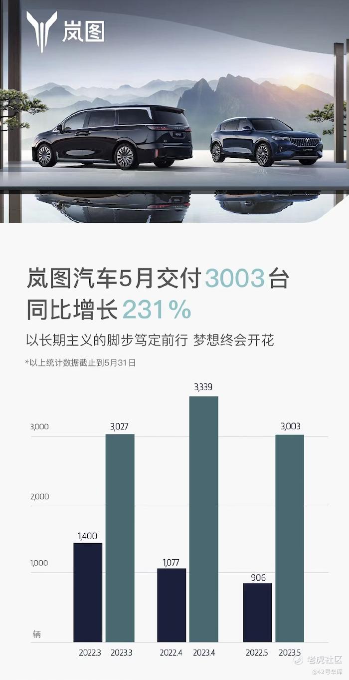 岚图汽车公布 5 月交付数据,交付新车 3,003 辆, 同比增长 231%,实现连续三个月销量超过 3,000。