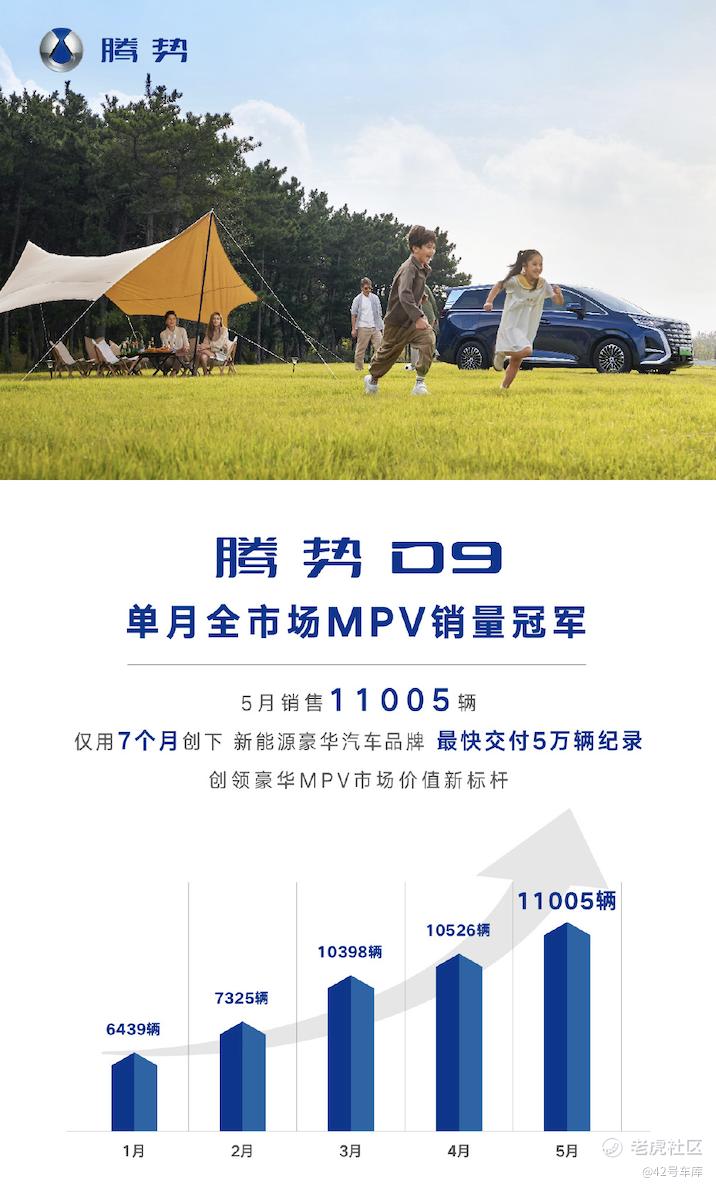 5 月腾势 D9 车型销售 11,005 辆,登顶单月全市场 MPV 销量冠军。截止 5 月份,腾势 D9 已累计交付 55,496 辆,仅用 7 个月创下新能源豪华汽车品牌最快交付 5 万辆纪录。