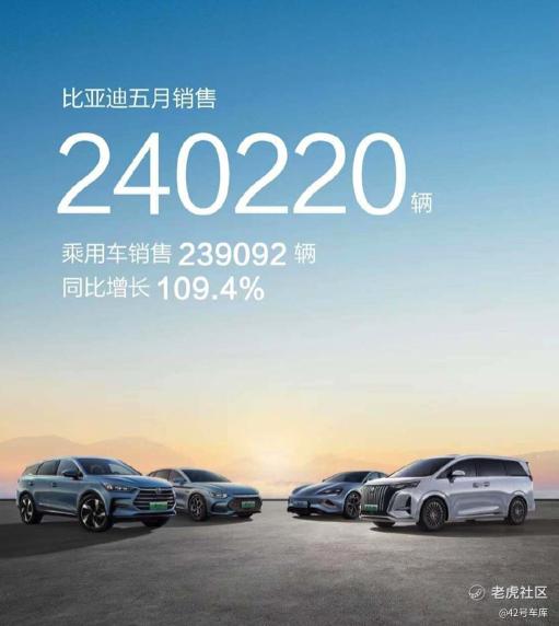比亚迪发布 5 月份产销快报,共销售新能源汽车 24.02 万辆,同比增长 108.99%,环比增长 14.23%。单月销售24万辆的成绩,也打破了此前比亚迪在 2022 年 12 月份销售 23.52 万辆的记录,创下月度历史新高。