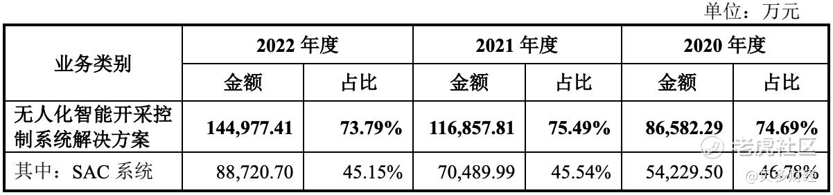 报告期内(即2020年至2022年),天玛智控来自无人化智能开采控制系统解决方案的收入分别为8.66亿元、11.69亿元和14.50亿元,占主营业务收入的比例分别为74.69%、75.49%和73.79%。
