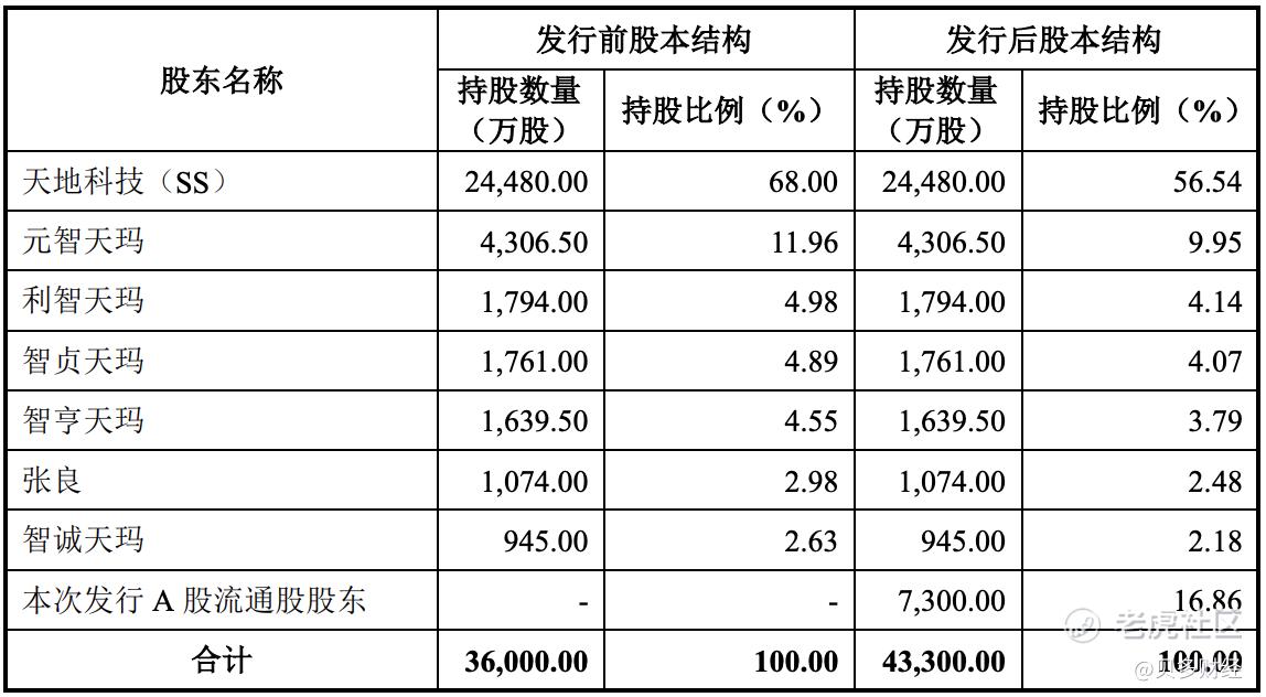 IPO后,天地科技持股56.54%,元智天玛持股9.95%,利智天玛、智贞天玛均分别持股4.14%,智亨天玛持股4.07%,张良持股2.48%,智诚天玛持股2.18%。