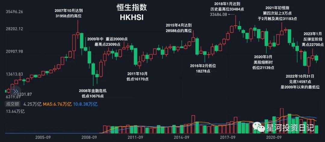 2022年3月,在科网股下跌、俄乌地缘冲突以及美联储加息等共同影响下,恒指时隔近6年再次跌破20000点大关,于3月15日盘中创下18235点的低位,随后在4月、6月又反弹至22000点上方。在美联储持续大幅加息、美元走强、国内疫情防控等因素影响下,2022年10月31日见底14597点,为2009年年中以来新低。随后的11月、12月恒指分别反弹27%、6%,2023年1月又涨10%,最高来到22700点。