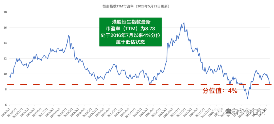 截至2023年5月31日,恒生指数市盈率(TTM)为8.73,处于2016年7月以来的4%分位值,处于2002年1月以来的5%分位值,属于低估状态。可点击查看指数、题材板块的最新估值讨论