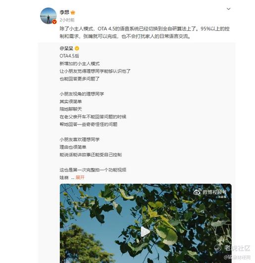 随后, $理想汽车-W(02015)$ CEO 李想转发了这篇博文,并表示“除了小主人模式,OTA 4.5 的语音系统已经切换到全自研算法上了,95% 以上的控制和需求张嘴就可以完成,也不会打扰到家人的日常语言交流”。
