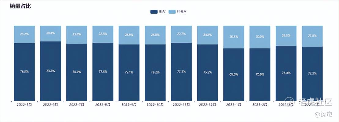 根据乘联会公布的数据来看,从2022年5月开始,直到2023年4月PHEV(混动车型)的销量占比明显在逐渐增多,BEV(纯电车型)的占比从原来接近80%到现在趋于稳定在70%,这都是肉眼可见的变化,证明混动车型在逐渐被市场认可。