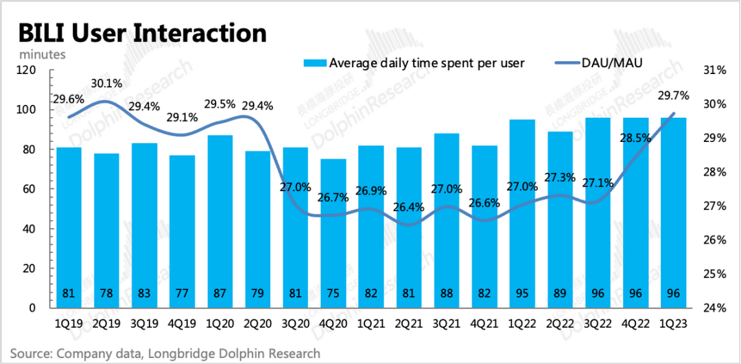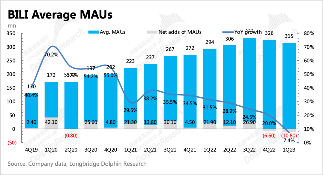 一季度,B站整体月活用户数为3.15亿人,同比增长7%,而环比流失1080万用户,明显差于市场预期,尤其在经济复苏的第一季度环比下滑,实在令人不安。