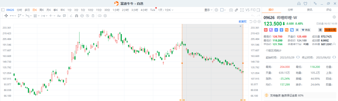 自停更潮开始,B站的股价已经连续两个月下滑。从4月份开始,B站股价已经下跌了35%,这与去年10月底,由于宏观经济预期转好,带来的近两倍的涨幅形成了鲜明的反差。