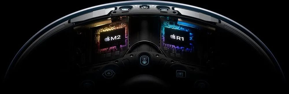 为了完成上述的操作,苹果在硬件配置上,屏幕采用了两块微型OLED显示屏,像素高达2300万,两只眼睛的分辨率均达到4K。芯片方面,设备配备了一块M2和一块R1芯片。