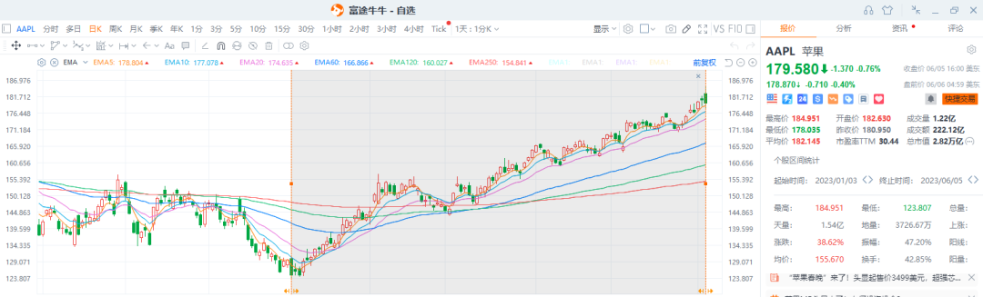 许多人关注的是,发布会开始后苹果股价由涨转跌。然而,昨夜同样是苹果股价创造历史新高的时刻。今年以来,苹果的股价已经上涨了近40%。