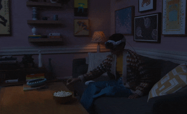 例如,如下图所示,只要戴上Vision Pro,你就可以立即将周围的环境变成私人影院,享受4K超大屏幕的观影体验。