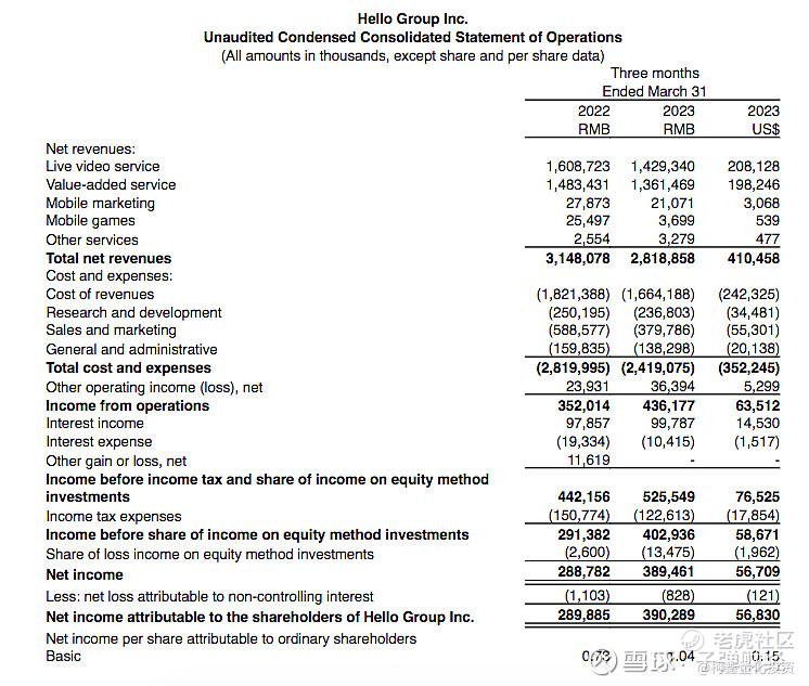 陌陌部门的营收从2022年第一季度的27.989亿元下降至今年一季度的25.101亿元;探探业务的营收从2022年第一季度的3.49亿元下降至2023年第一季度的3.086亿元。