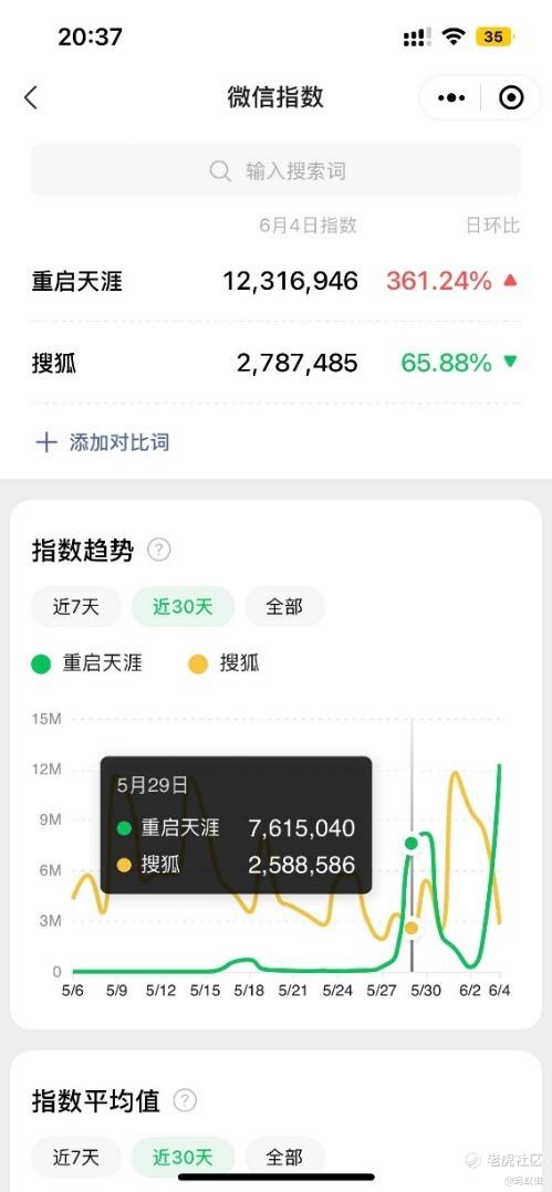 当宋铮最终选择了公域流量大的抖音时,就错失了能通过社交裂变快速触达目标网友、对待导流更为友好的微信平台。事实上,这次重启天涯活动在微信上的传播效果还是不错的,在七天七夜直播期间,其微信指数达到了800万上下,比一些老牌网站还高。请注意,这还是天涯公司和宋铮团队没有怎么发力的结果。