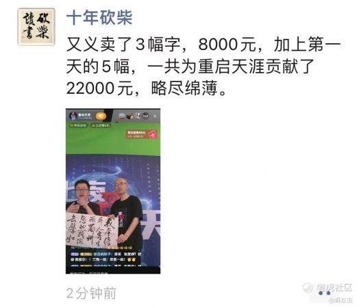 反倒是十年砍柴的书法作品,因为有着网络名人+天涯事件的双重加持,即便售价高达2000或3000元,仍然受到了网友的热烈追捧。他两次亮相直播间带来了8件作品,两次都是上架很快就被秒光,为重启天涯筹得2.2万元的净收入,凭一己之力本次筹款作出了1/10略强的贡献。
