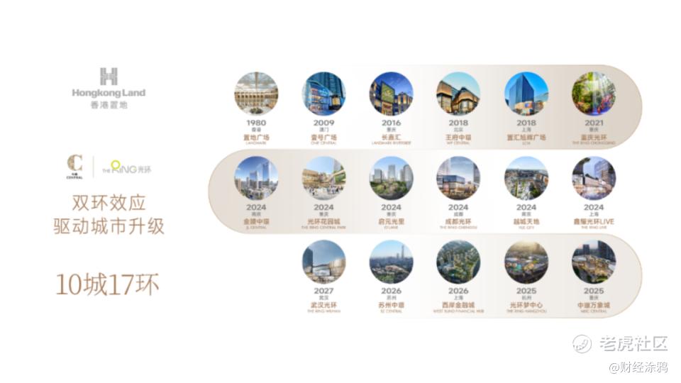 截至目前,香港置地已相继在香港、澳门、重庆、北京、上海、南京、成都、杭州、苏州、武汉十个城市共计落子17环。