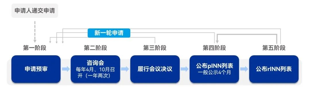 WHO INN申请的审议大致分为5个阶段:申请预审——咨询会——履行会议决议——公布提议INN(Proposed INN, pINN)列表——公布推荐INN(Recommend INN, rINN)列表。