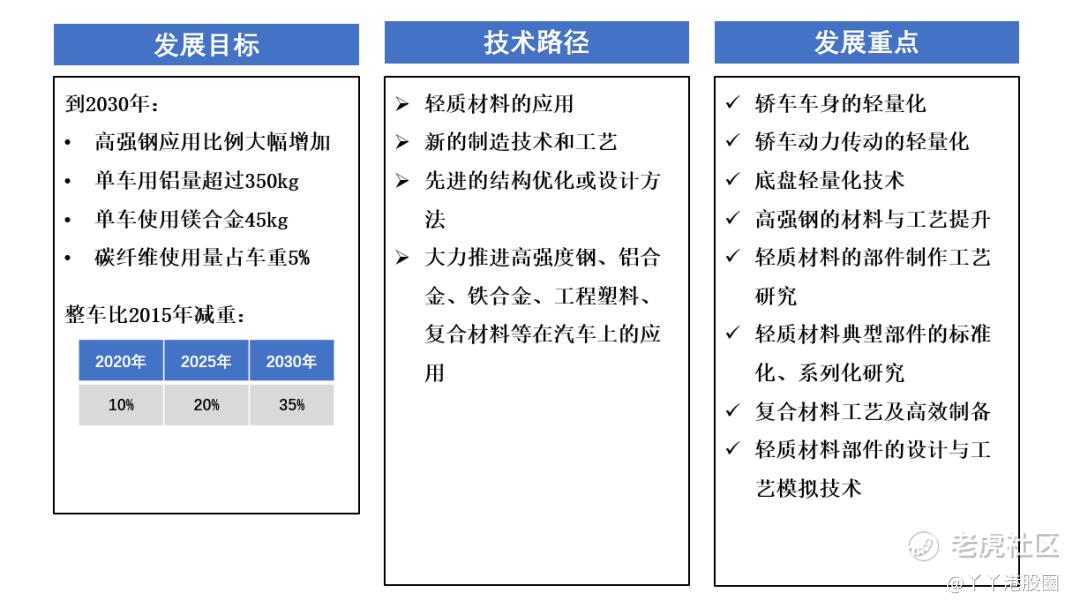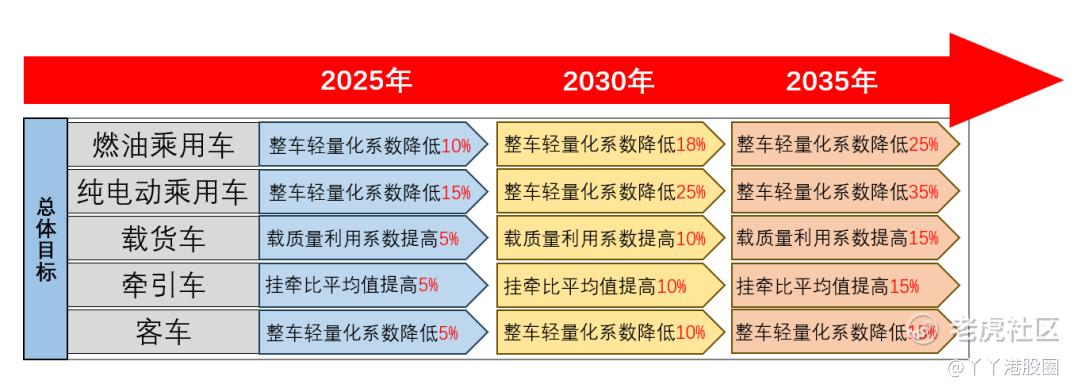 2020年,由工业和信息化部装备工业一司指导,中国汽车工程学会牵头组织编制的《节能与新能源汽车技术路线图2.0》中,对于我国自主轻量化技术开发和应用体系的构建,提出近期以完善高强度钢应用为体系重点,中期以形成轻质合金应用体系为方向,远期形成多材料混合应用体系为目标。同时引入了新概念作为衡量标准,即“整车轻量系数”、“载质量利用系数”、“挂牵比”等作为衡量整车轻量化水平的依据。到2035年,预计燃油乘用车整车轻量化系数降低25%,纯电动乘用车整车轻量化系数降低35%。