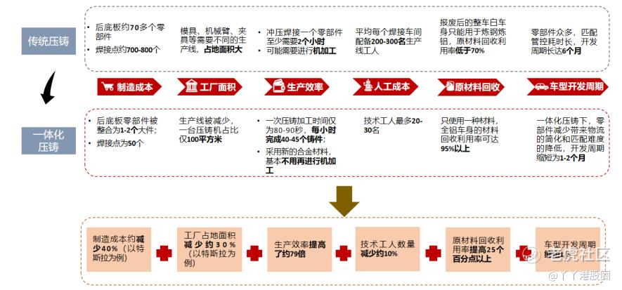 而由于特斯拉在新能源汽车行业类似APPLE的存在,和一体化压铸技术应用在ModelY生产线的夸张数据,市场开始意识到这可能是汽车制造业新的工业革命。