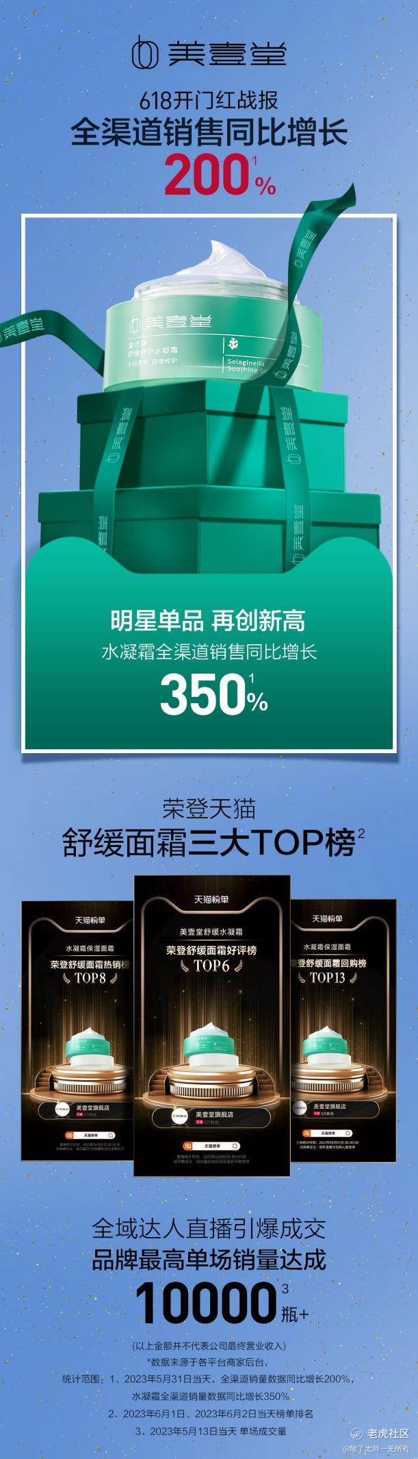 2023开年的自我介绍:“丽人丽妆旗下品牌美壹堂正在凝聚研发力量构建‘修护+’系统,让敏感肌实现功效护肤自由”。在年中618期间终得认可,618首日成交额全渠道同比2022年增长200%,天猫渠道同比增长12%,迎来了618开门红。