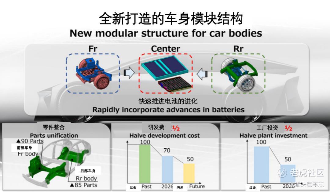 在制造方面,将全新打造三大模块的车身结构,采用一体化铸造技术,实现大幅度的零件整合。由此有效降低车辆研发费用及工厂投资。此外,通过高智能化的车辆自动化移动生产线技术,促进生产工序和工厂投资分别减少一半。
