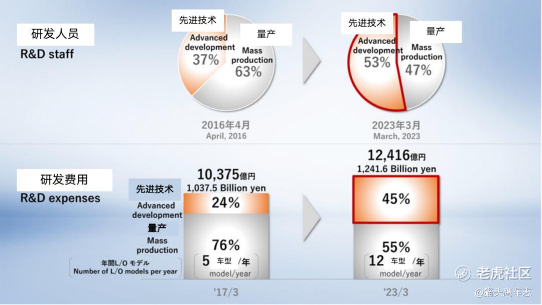 丰田表示截至2023年3月,先进技术开发投入的人员,已占到整体开发人员的一半以上,在不断提升研发费用总投入的同时,将其中的一半投入到先进技术的开发之中。