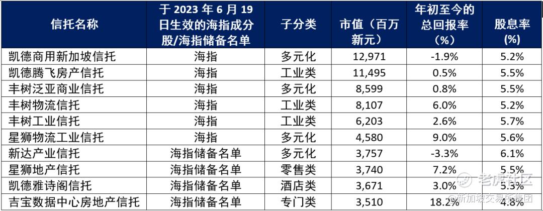 自6月19日开盘海指成分股中将有6只新加坡房地产信托(S-REITs),而海指储备名单中将有4只S-REITs(按字母顺序排列)- 凯德雅诗阁信托、星狮地产信托、吉宝数据中心房地产信托及新达产业信托-还有奥兰集团。
